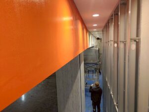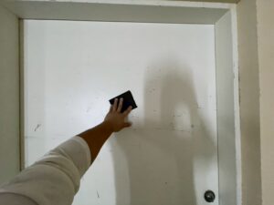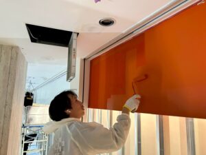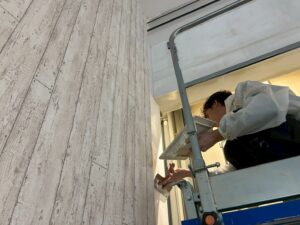 塗料が均一に乗るように既存の壁面を補修し、仕上がりがきれいになるように整えていきます…