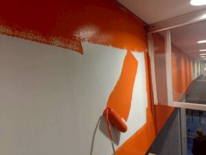 塗料が均一に乗るように既存の壁面を補修し、仕上がりがきれいになるように整えていきます…