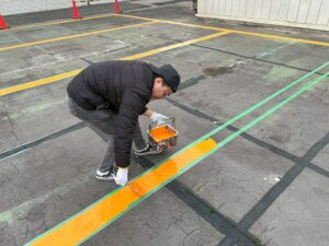 ライン引き専用塗料を使用し、丁寧にラインを引いていきます…
