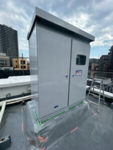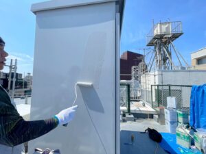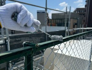 フェンスや階段、キュービクルには、下地処理後に錆止め混合塗料を2回塗り、フェンスネットも塗っていきます👨🦯