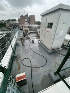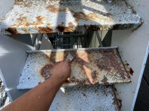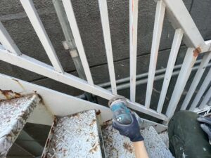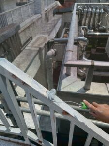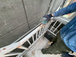 具体的な作業として、高圧洗浄、ひび割れ・剥がれの補修、サビ除去・シーリング処理などがありしっかりと下地処理をした後、錆止め混合塗料を塗ります。